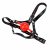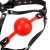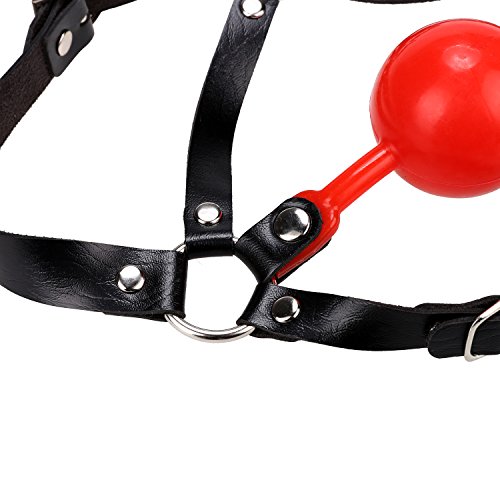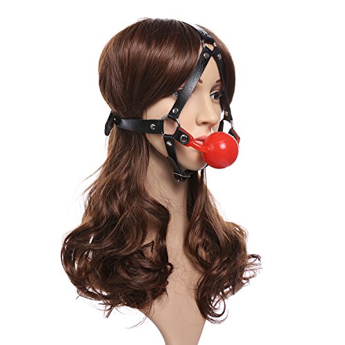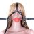 Der rote Ball vor den roten Lippen sorgt für einen tollen Kontrast mit den schwarzen Riemen, die unnachgiebig mit Metallringen verbunden sind.